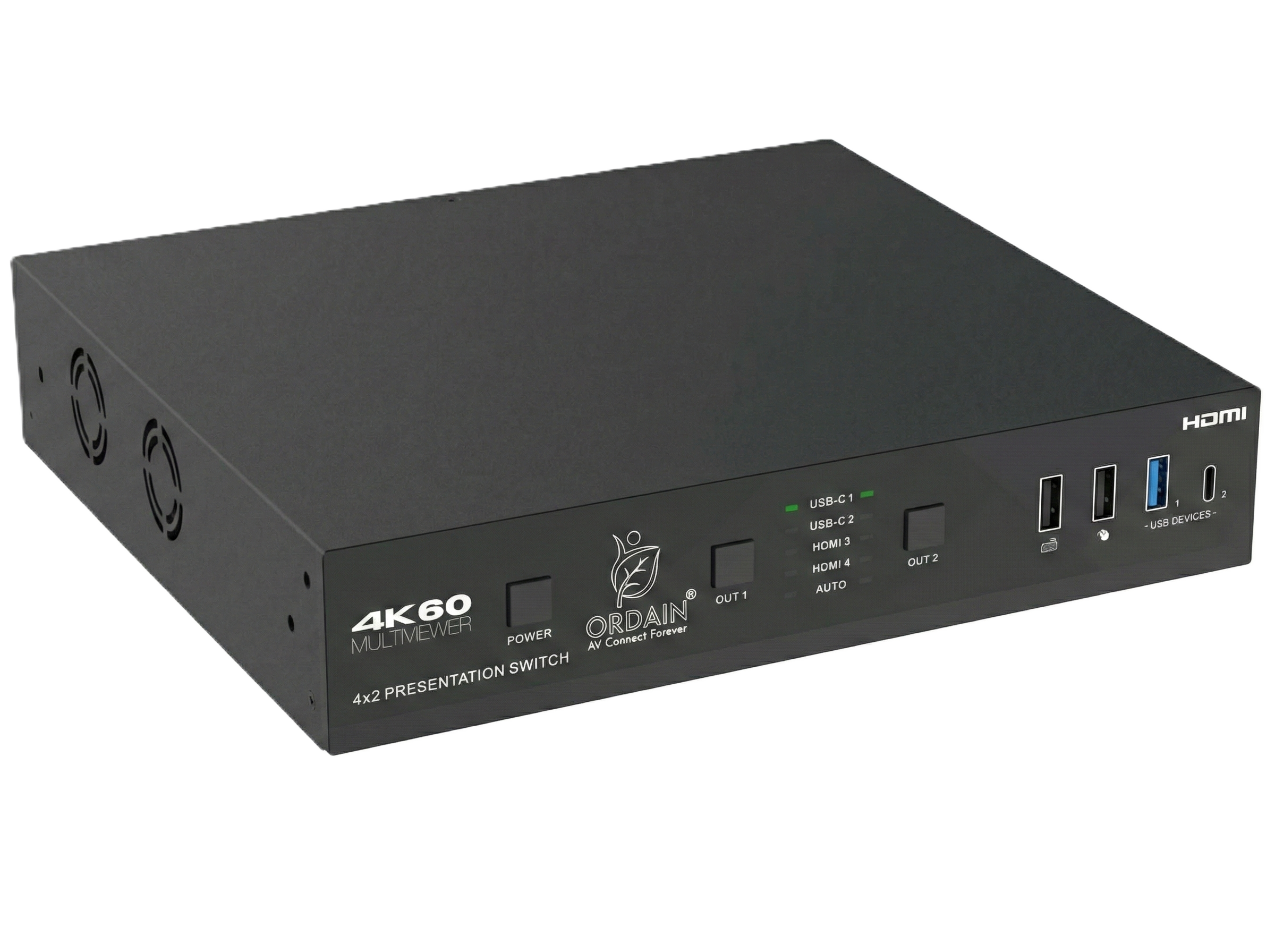 This Ordain’s 4×2 seamless presentation switch is a comprehensive A/V and control solution supporting resolutions up to 4K@60Hz (4:4:4) with HDCP 2.3 compliance and multiview capabilities. It features two HDMI and two USB-C inputs—with the USB-C ports offering A/V support, 5Gbps data, 60W device charging, and Gigabit Ethernet—alongside two HDMI outputs and a mirrored HDBaseT 3.0 output capable of extending video and USB 2.0 KVM signals up to 70 meters. Beyond video, the unit delivers robust audio processing through a built-in DSP with mixing and EQ, audio embedding/de-embedding, and Dante 2×2 networking. The entire system can be easily managed via front panel buttons, IR, RS-232, TCP/IP, or a built-in Web GUI that handles A/V routing, automatic display control, and EDID management.