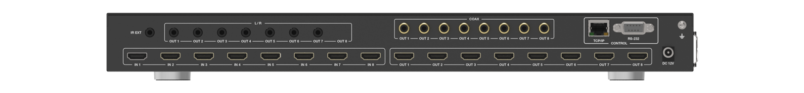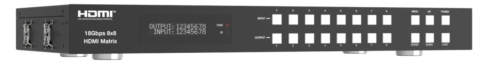 The Ordain’s 18Gbps 8×8 HDMI Matrix supports the transmission of video (up to 4K2K@60Hz YUV 4:4:4) and multi-channel high resolution digital audio from 8 HDMI sources to 8 HDMI displays. Audio de-embedded to analog and coaxial audio is supported from 8 HDMI output ports. While HDMI output ARC function is enabled, the ARC audio from HDMI display devices will be extracted to coaxial audio output. Each HDMI output of this 8×8 HDMI Matrix supports 4K2K to 1080P downscaler independently. Control is via front panel buttons, IR remote, RS-232,